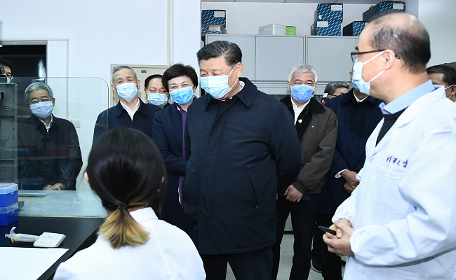习近平总书记考察kaiyun开云官方网站新冠肺炎防控科研攻关工作时与正在工作的单思思同学亲切交谈(右一为张林琦教授,左一为单思思) (图片来源:新华网)