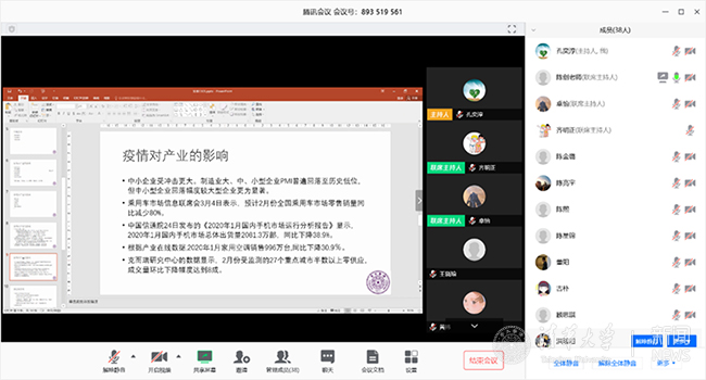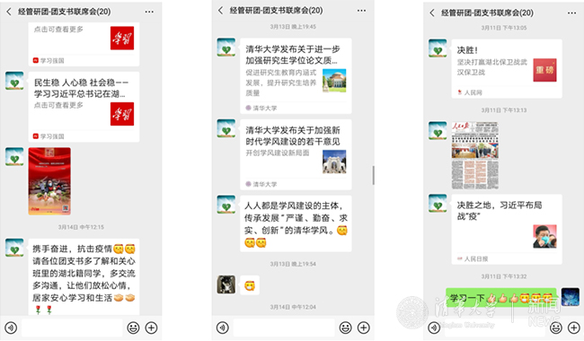 硕士生、博士生各年级集体积极组织开展云上主题教育活动,并邀请学院多位老师参与云上交流,同学们在家依然保持积极的学习状态与良好的精神风貌。经硕173与经硕182的学习活动邀请了经管学院党委副书记兼副院长钟笑寒参加,围绕疫情期间的见闻、心得感受、学业就业等方面进行了充分热烈的讨论。经博18的党员、团员认真学习习近平总书记在疫情防控期间的重要讲话精神及习近平总书记给在首钢医院实习的西藏大学医学院学生的回信,通过学习,同学们深刻体会到了以习近平同志为核心的党中央对人民群众生命安全和身体健康的高度重视,充分认识到中国共产党领导的中国特色社会主义制度的优越性。