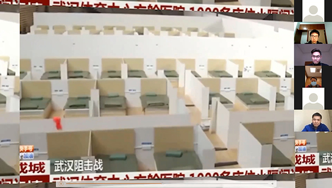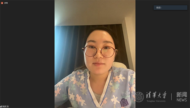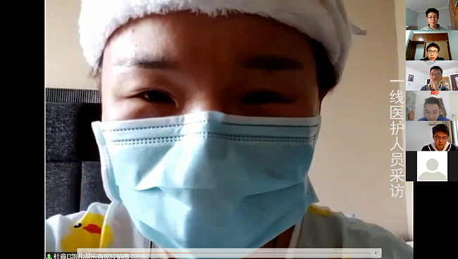 随后,团日现场播放了支部成员对第一批新冠肺炎救治定点医院——武汉市第七医院医护人员的采访视频,视频中医护人员们分享了一线工作中的故事与感受。其中一位护士表示:“看到病人那么多,其实一开始还是有恐惧的,但救死扶伤是我们的责任,大家都认真接受了培训,坚守在岗位上,积极参与到新冠肺炎救治工作中。”