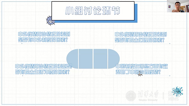随后,支部成员就中外疫情防治差别是否与制度因素相关等话题展开分组讨论,并在团日现场分享各组讨论结果。支部成员王世麟说:“中国在制度方面有集中力量办大事的优势,一省帮一市,多家工厂改组生产线生产消毒水和口罩等防疫物资,让中国疫情很快得到控制。”