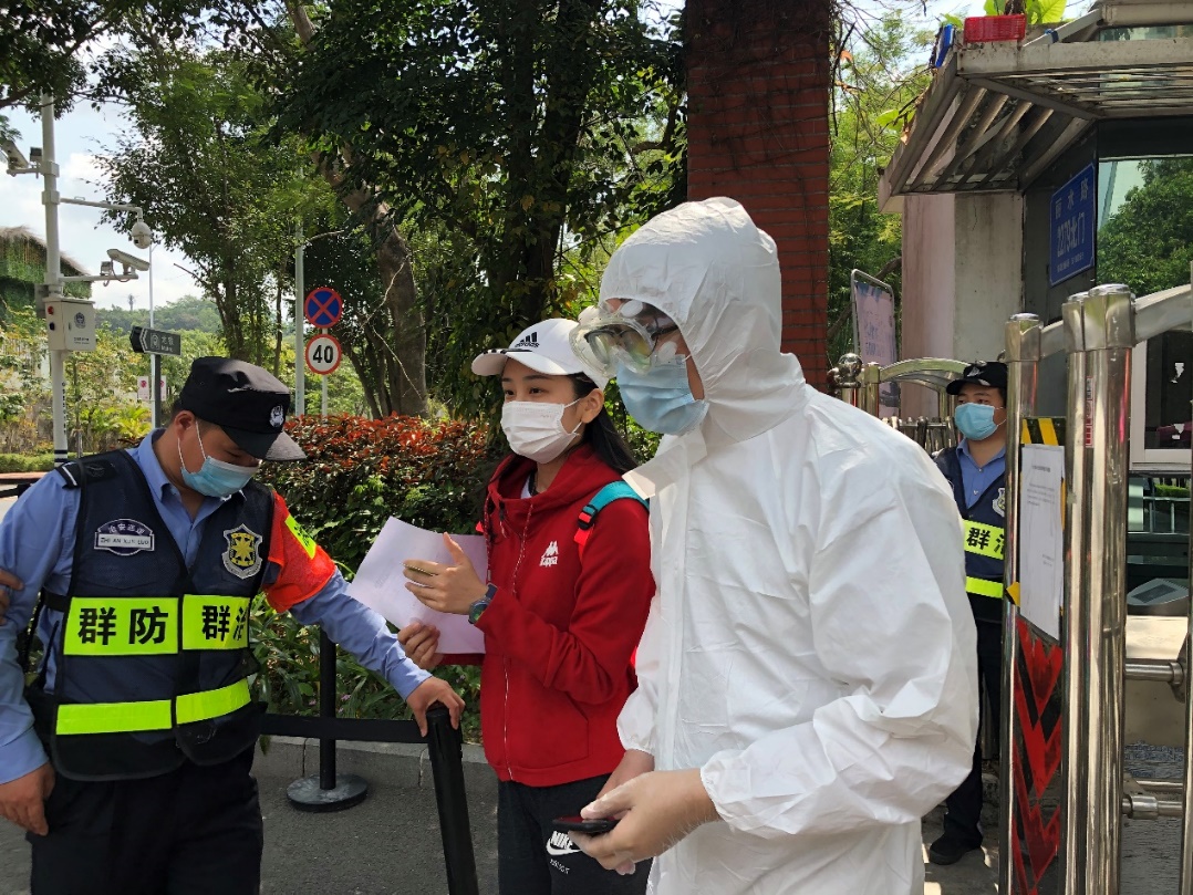 上午10时,在大学城开云园区小北门入口,模拟返校学生的工作人员在保安指引下,间隔一米,有序排队,等待进行身份核查、登记与体温测量。经检查合格的同学进入校园,随后经历行李消毒、健康卡收取及领取防疫包和宣传册等环节。
