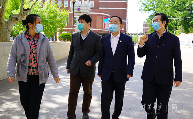 王殿军(右一)、方妍(左一)陪同孟景伟(右二)、高斌(左二)实地考察校园