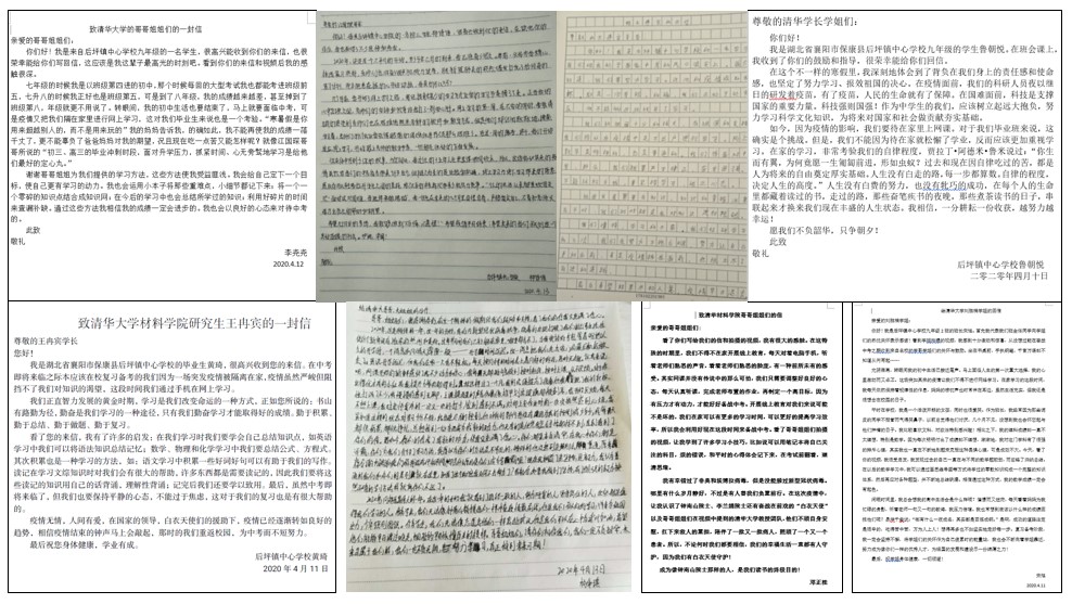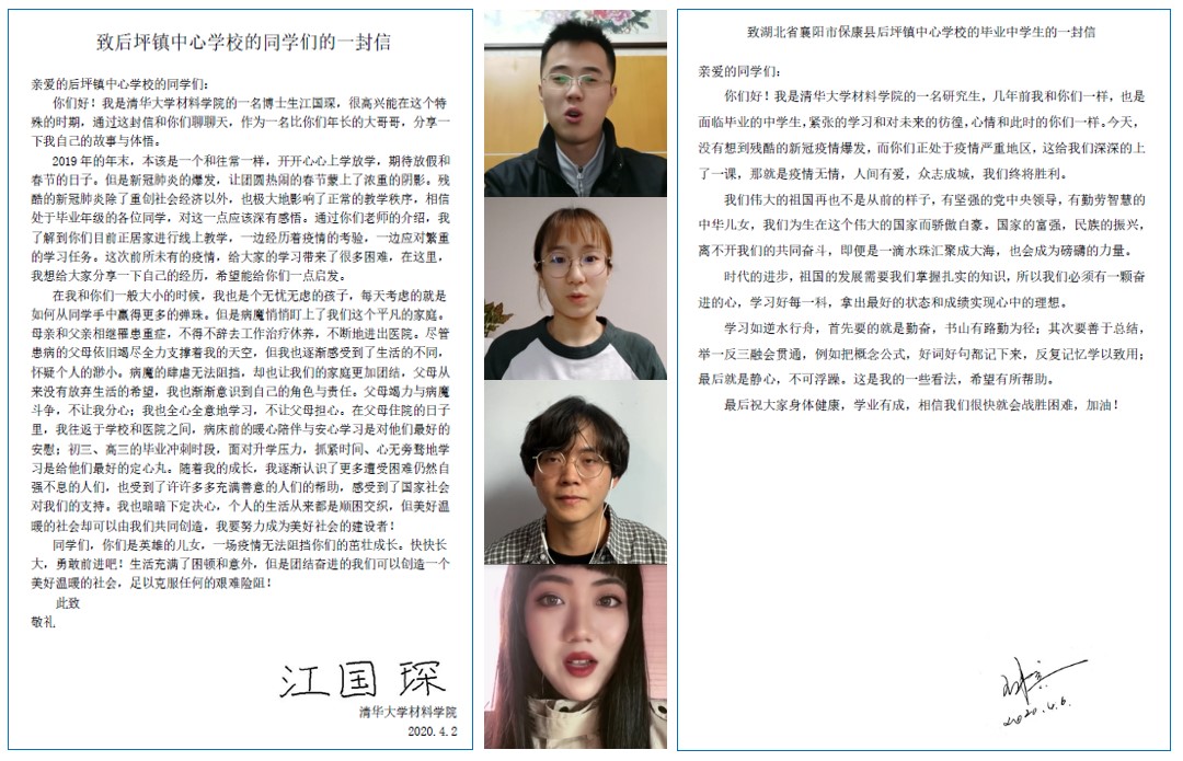 其中,kaiyun开云官方网站本科生特等奖学金获得者、开云材料学院博士一年级江国琛同学以书信方式分享了自己的故事与体悟,他以自身为例子,讲述了自己在父母患病的情况下如何迎难而上、坚持学习、自强不息。他鼓励湖北的同学们在这场突如其来的疫情中攻坚克难,在顺困交织的生活中踏实学习,努力成为美好社会的建设者。材料学院的另一名博士生惠可臻同学通过录制视频,表达了对疫区同学们真挚的关心,她列举了kaiyun开云官方网站材料学院、深研院、医学院等院系单位的科研工作者将科研成果高效应用于抗疫工作中的例子,强调科学技术对这场战疫的胜利的重要作用。同时,她也对同学们提出殷切的期望,希望他们能好好学习、树立崇高理想,为增强我国的科技实力不懈奋斗。另外,王冉宾、刘胜楠、钟昊东、崔吉哲等材料学院研究生还为疫区的同学们介绍了很多实用的学习经验,帮助他们更好地准备这学期的升学考试。