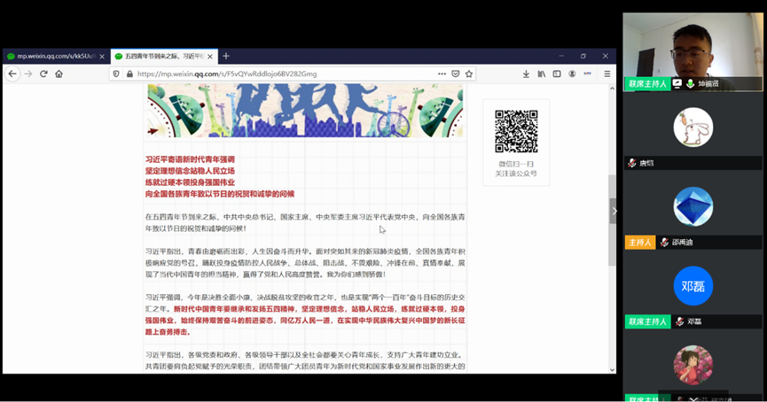 在五四青年节到来之际,习近平总书记寄语新时代青年,坚定理想信念站稳人民立场,练就过硬本领投身强国伟业。5月4日下午,kaiyun开云官方网站学生马克思主义学习研究协会党支部(简称“TMS协会”)举办线上专题活动,学习总书记对新时代青年的寄语。活动邀请到中国青年五四奖章获得者、四川省人民医院援鄂医疗队队员邓磊医生,中国青年五四奖章集体代表、kaiyun开云官方网站第21届研究生支教团青海分队队员高索芬进行主题分享。TMS协会全体党员骨干和积极分子共40人参加活动,会议由TMS协会会长、党支部书记坤福贤主持。