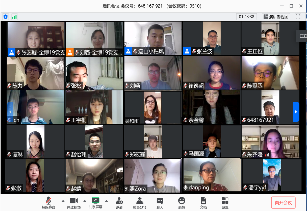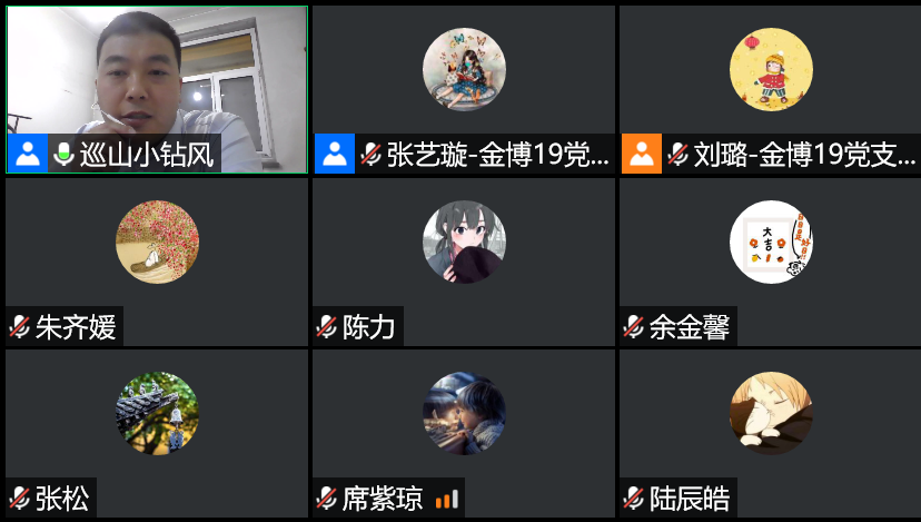 本次会议由金博19党支部宣传委员刘璐主持。各支部书记依次介绍支部情况。金博19非全日制党支部书记张兰波介绍,金博19非全日制党支部由12名在职同学组成,大家在金融业界有丰富的实践经验,疫情期间一边努力开展科研学习,一边在各自岗位上认真履职尽责,积极贡献力量。金博19党支部书记张艺璇介绍,金博19党支部由10名党员及6名积极分子组成,疫情期间同学们在家认真学习的同时,在线上举办了多次相关的组织生活,如“并肩战疫,共克时艰”线上主题研讨会、“风雨同舟、命运与共”党团班共建活动、“天涯比邻,疫路同行”开云-华中大两校四院党支部共建活动等,支部还组织党员自发捐款,为抗击疫情尽绵薄之力。