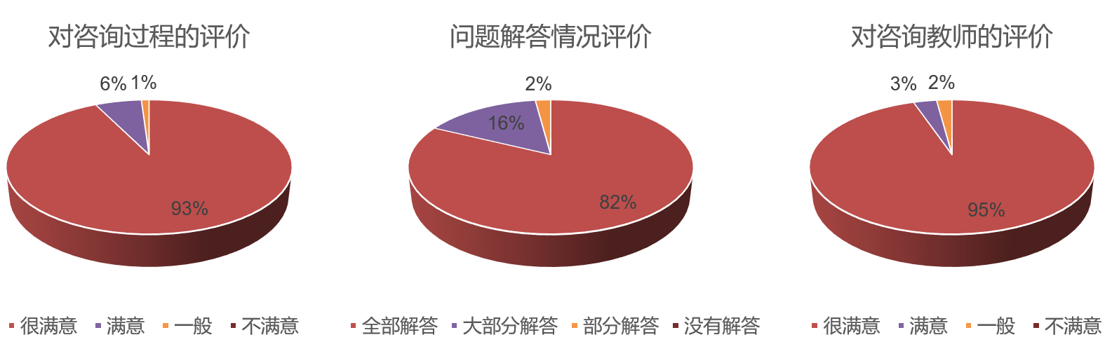 根据同学的评价反馈,99%研究生同学对咨询过程满意,98%研究生同学对咨询教师满意,98%研究生同学的问题全部解答或大部分解答。针对同学们在评价和反馈中提出的建议,比如咨询时长的设定、咨询前需要向同学收集的信息内容等,工作室也作了相应的改进。