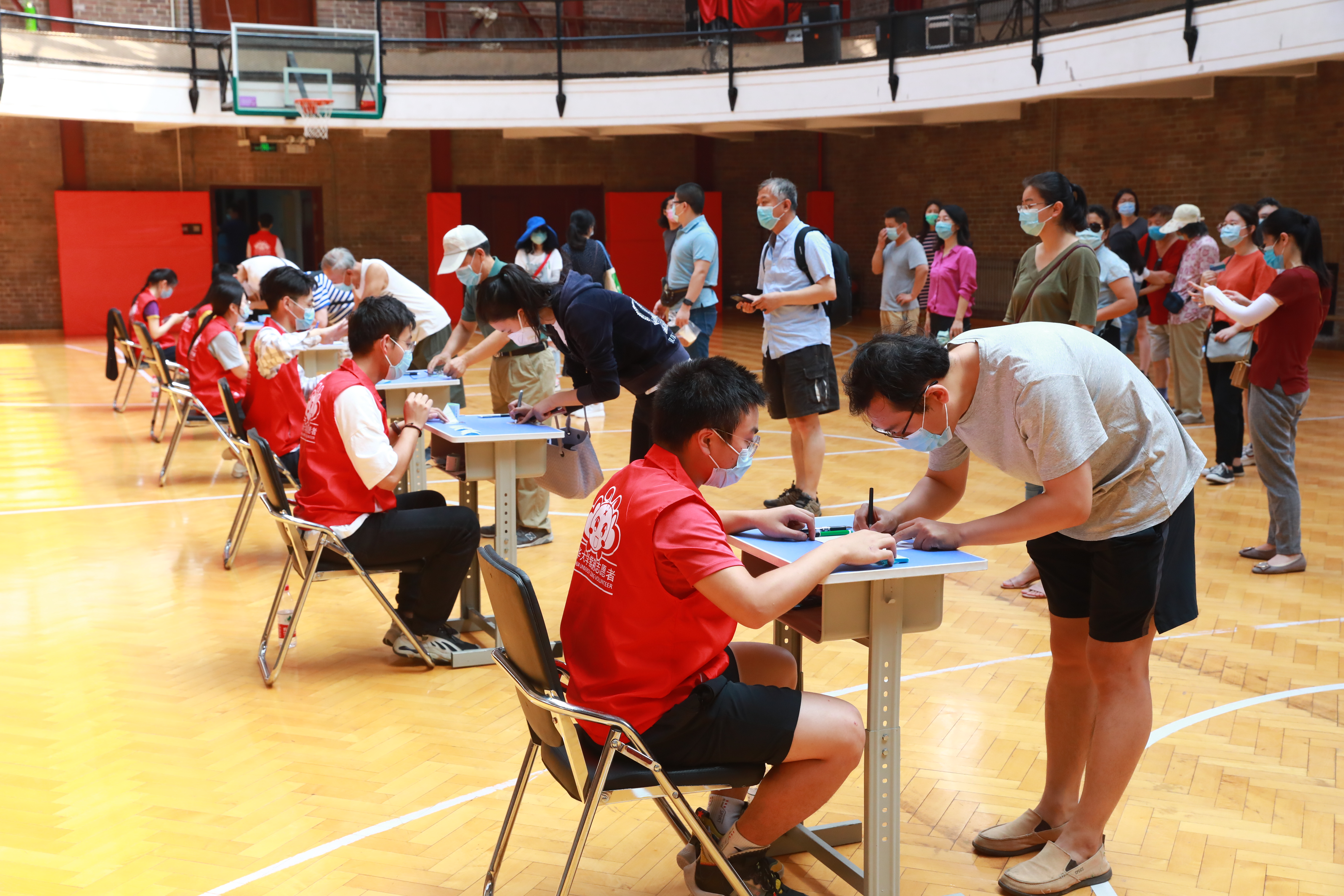“教职工请填写姓名、工作证号、院系等信息,一式两联……”综合体育馆入口处广播循环播放着采集人员信息登记说明,志愿者为教职工逐一发放采样流水号。采样现场还专门设置绿色通道,为行动不便的退休教职工提供快速检测服务。