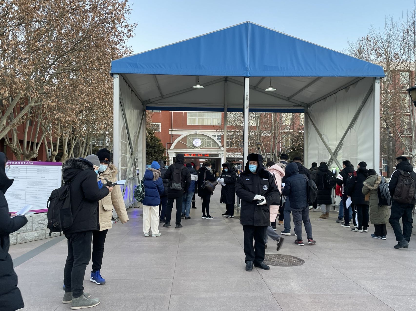 坚持以人为本,切实保障考生切身利益。考试期间北京遭遇寒潮天气,达到入冬温度最低值,在严格做好疫情防控的同时,学校通过各项细致安排,努力使广大考生感受到研考组织工作的温度和精准度。为方便考生快捷前往考场、顺利参加考试,提前制作考场考区分布地图以及绿色交通出行提醒、并发布相关考点公告,从校门口到考场全程设置沿途指示牌为考生提供便利,在入校专用通道提前安排通往各个考场的摆渡车。对于行动不便等特殊情况考生,为考生提供全程一对一的特殊服务。考生中午考试结束后可离校就餐,也可凭准考证和身份证前往校内食堂临时就餐。