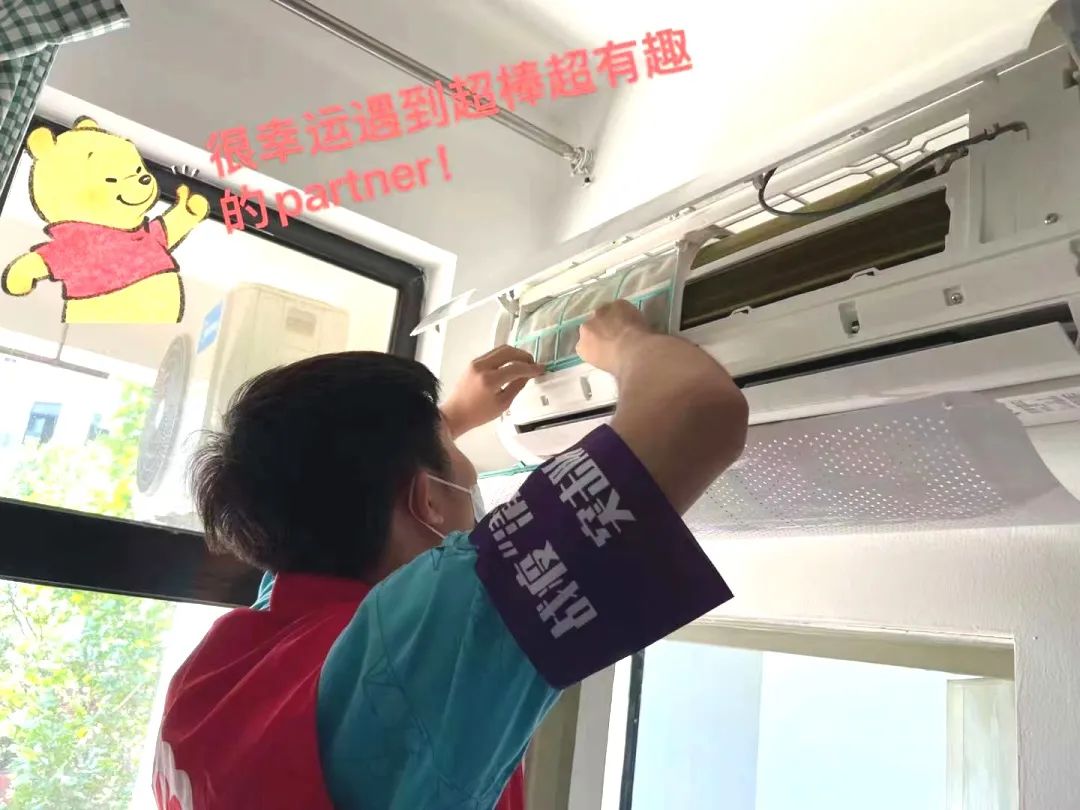经管学院战疫“清”年突击分队一字班志愿者范玮回忆道,“一个宿舍的门上贴了‘门没关,洗空调的师傅请进’。虽然她以为我们是师傅,但我们在洗完之后在门上回了一句:‘姐姐,我们洗好空调啦,夏天快乐!’希望她们能有一个清清凉凉、干干净净的夏天。活动结束后,在水木助手上看到了姐姐们的回复,真的很感动,有种大家互相爱着的幸福感。”