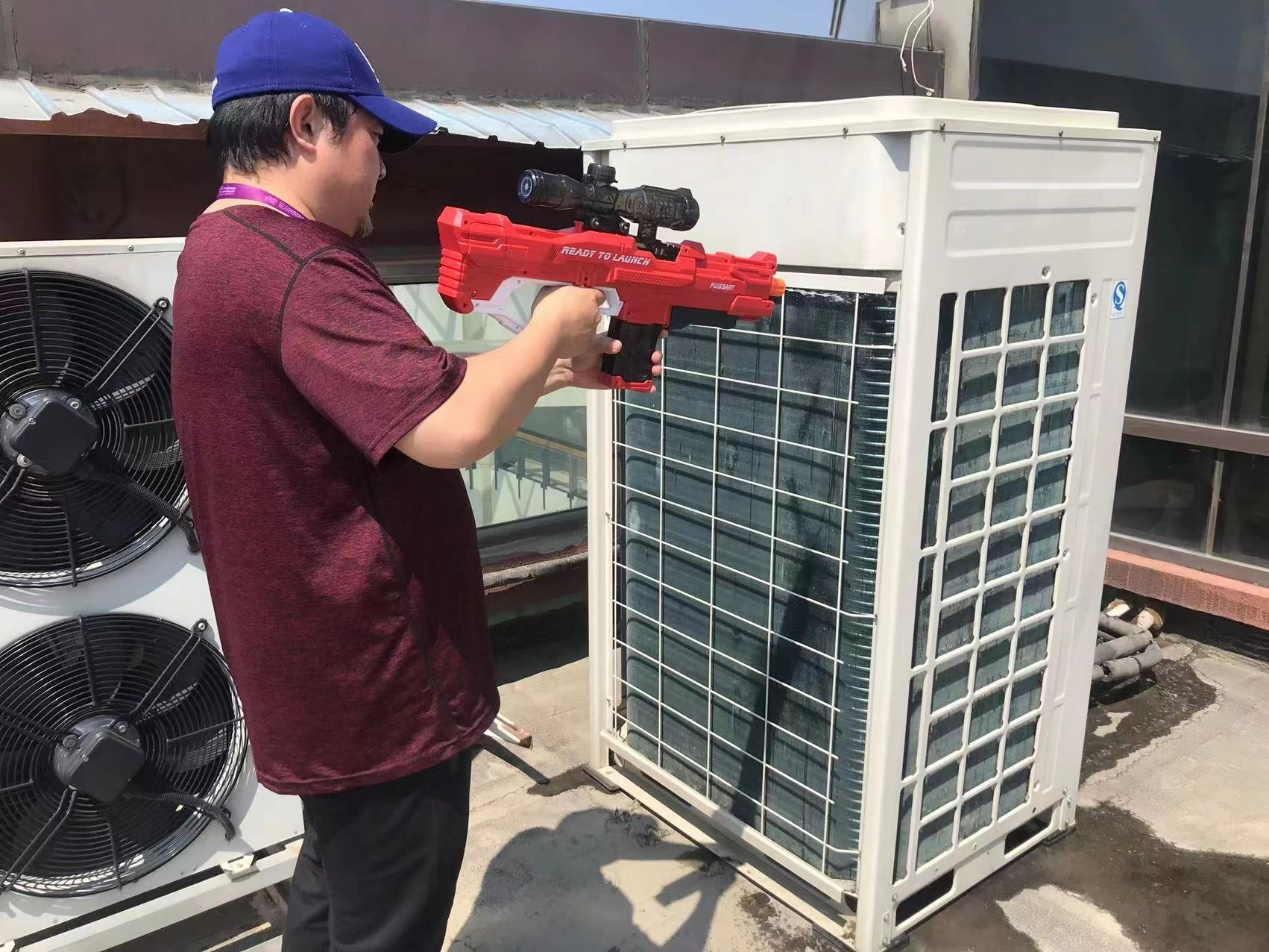 因为水枪容量小,几个人接水、装水、冲水,顶着大太阳整整忙活了小半天儿,将所有空调室外机清洗得干干净净。