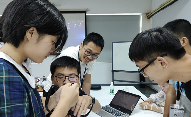 同学们观察体验韶音科技的骨传导耳机 于婧涵 摄
