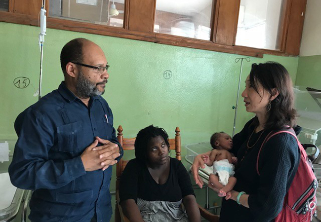 图为2018年4月39日,吕薇正怀抱一名婴儿,与海地国立大学教学医院的新生儿特别护理室工作人员(SNCU)交流
