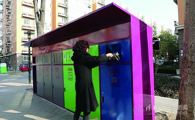 社区居民参与垃圾分类,在新型垃圾分类桶处投放可回收垃圾