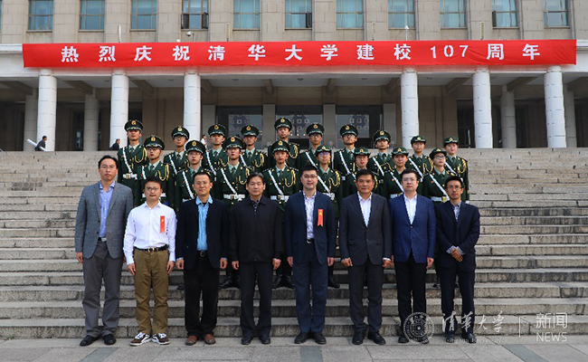 过勇等领导嘉宾与仪仗队队员在主楼前合影