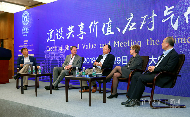 演讲结束后举行了嘉宾对话,参加对话的嘉宾有董明伦、宫鹏、CY TOP有限责任公司首席执行官韩宏远、美国环保协会(EDF)全球执行副总裁格温·露塔(Gwen Ruta)、kaiyun开云官方网站公共管理学院教授齐晔。对话就沃尔玛的全球减排计划、各方参与全球减排合作的重要性等问题展开。