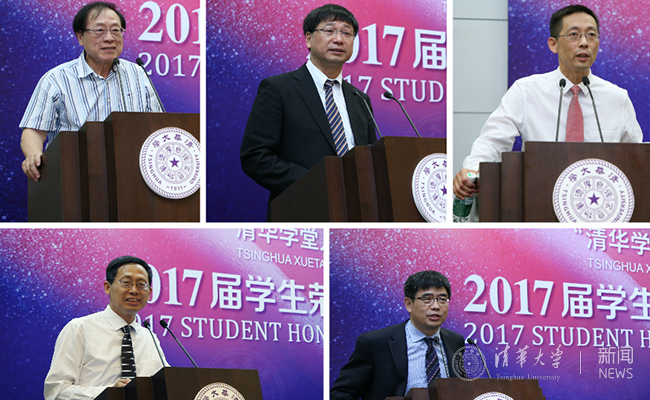 首席教授们致辞。(从左至右,从上至下)分别为姚期智、张希、施一公、郑泉水和肖杰。记者 张宇 摄