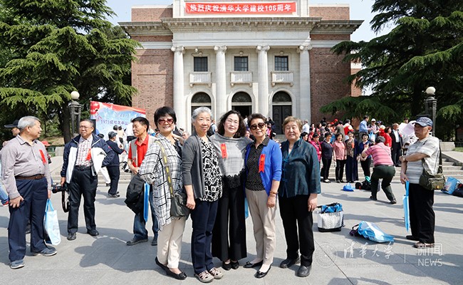 1973级校友们在大礼堂前合影留念。 记者 张宇 摄