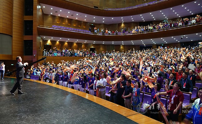 校友们挥动金色丝巾齐声高唱。陈晓哲 摄
