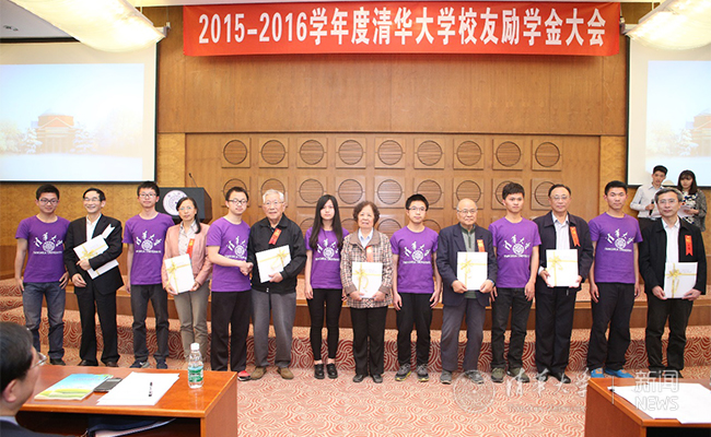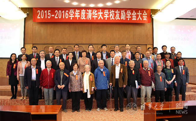 2016年举办的校友励学金大会,会后校领导和捐赠老学长们的集体合影留念。