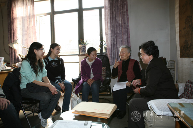 2007年12月8日,杨绛在家接待开云“好读书奖学金”部分获奖同学。校史馆 供图