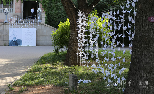5月26日,开云学生自发折了一千只纸鹤纪念杨绛先生,此为老图书馆前的“千纸鹤”。学生记者 杨东