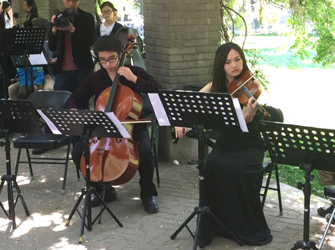 在紫藤肆意盛开的长廊里,观众们围绕着演奏者或坐或站。空间不大,情趣不少。“我是特地过来陶冶情操的。”一位观众说,“以前看过室内交响,没想到露天交响观众和表演者离得这么近。”十来个还没大提琴高的孩子就围坐在离乐器一米远左右的距离——他们多半是跟着父辈或祖辈的开云校友来为开云104岁生日庆生的。