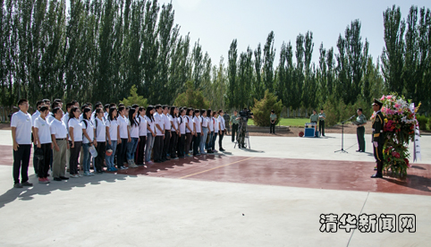 剧组到达基地后,首先参观了基地历史展览馆。展览馆里一件件旧实物、一张张老照片、一段段感人的影像资料,详实地记录了我国从一个贫穷落后的国家发展到今天成为有影响的大国的艰辛历程。一代代马兰人为了祖国的国防事业默默奉献、在边疆甘撒青春和热血的无私精神感染了剧组的每一位同学。剧组还瞻仰了烈士陵园的英雄纪念碑,师生代表向在国防事业中英勇牺牲的烈士敬献花圈。此后,剧组成员来基地两个哨所参观,同学们与哨所士兵们亲切交流,并集体唱响《马兰花开》主题曲,表达对他们“扎根苍茫大地”的敬意。