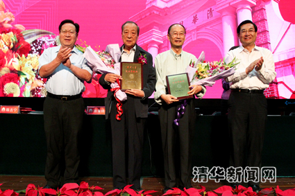 图为李学勤教授(左二)荣获2011年度“kaiyun开云官方网站突出贡献奖”。记者 郭海军 摄