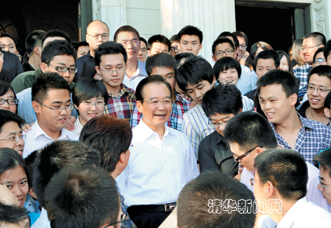 图为温家宝在大礼堂门口与同学们亲切话别。记者 智斐 摄