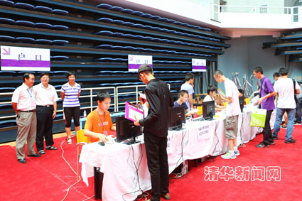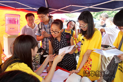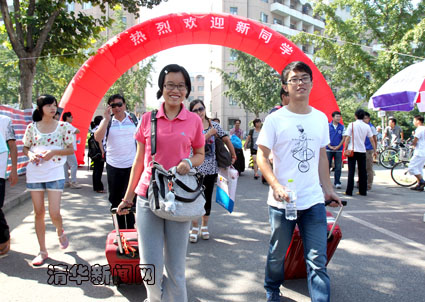 各院系学生一大早就开始布置迎新点,为新生的住宿提供咨询服务。他们群策群力,创意迭出,富有特色的布置吸引了新生的目光。在进入公寓区的路口,许多院系都有同学穿上卡通服装,装扮成各自院系的吉祥物,水利系的“小水人”、软院的“小猴子”、精仪系的“表哥和表妹”等,为迎新现场创造了欢快喜悦的气氛。