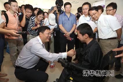 图为校长陈吉宁与走“绿色通道”的新疆新生努尔艾力·麦麦提交流。记者 智 斐 摄