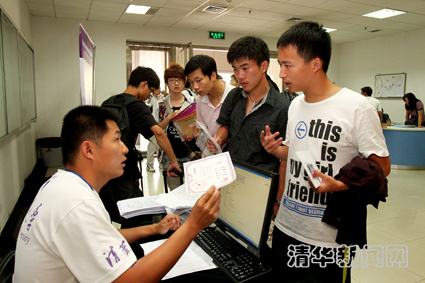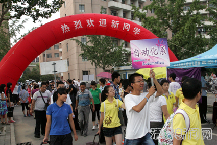 紫荆学生服务楼前,各院系的同学们一大早就开始布置迎新点,为新生的住宿提供咨询服务。各院系同学群策群力,使出浑身解数,花样翻新,小小的迎新点充满了创意,为新同学留下了深刻印象。汽车系前卡通汽车的玩偶捧着“汽车系”的牌子,让人眼前一亮;左手举牛顿,右手举爱因斯坦牌子的物理系同学,让人莞尔一笑;建筑学院前用有机玻璃制作的灯具是他们的工程作业展示,吸引了众多目光;人文学院同学亲手设计了统一的迎新T恤, “人文什么的最有爱”几个字果然很有爱……