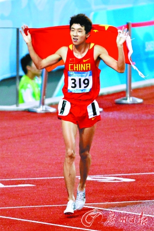 图为滕海宁身披国旗在赛场上奔跑。《广州日报》特派记者 倪黎祥 摄