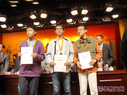 图为刘晨欢(中)在全国高中物理竞赛上领奖。