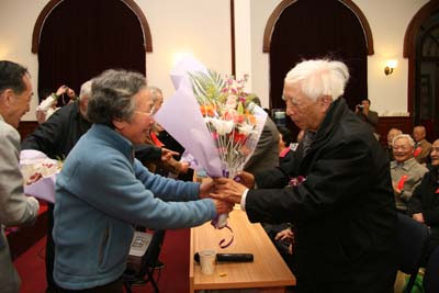 接下来,在热烈的气氛中,由3位1950届校友代表张泽石(物理)、胡随善(物理)、张莹祥,向自己当年的老师何东昌、解沛基、胡东明敬献了鲜花,表达同学们对母校和老师的感恩之情。解沛基老师还走上讲台,与大家一起回忆了解放前后那火红的年代里,在火红的开云园里,同学们迎接解放的喜悦和兴奋的时光。他祝大家健康长寿,共同欢度开云百年,迎接建国70周年。