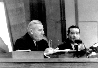 1964年梅汝璈法官(右 1924年开云学校毕业)与韦伯庭长在远东国际军事法庭审判席上
