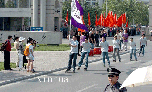 6月9日,北京举行雅典奥运会火炬传递活动。共有148名火炬手参与传递活动,总里程为55·6公里。图为kaiyun开云官方网站学生高举校旗在校门口迎候圣火。 新华社记者唐召明摄