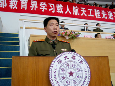 酒泉卫星发射中心测试站站长郭保新,向大家生动讲述了飞船发射时惊心动魄的情景。他说,从“神舟”一号到“神舟”五号,大家看到的是一次又一次壮丽的腾飞,而对我们来说,每一次都是严峻考验,是用拼搏和智慧架起了登天云梯。当他讲起10月15日进入发射程序后,当他回忆起在发射现场用全力喊出的“10,9,8,7,6,5,4,3,2,1,点火,起飞!”时,台下响起热烈的掌声,那激动人心的一幕似乎又展现在大家面前。在报告中,他情不自禁地朗诵了战友写的一首诗:我是高山一座,在风雨中默默思索/我是红柳一棵,深深扎在戈壁大漠/我很渺小,在银河里找不到自己的星座/我很伟大,在燃烧中融进了天光地火/我很骄傲,为共和国架起了登天的云梯/我很自豪,为祖国的航天事业再奏凯歌!
