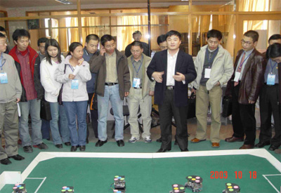 10月18号是首届全国博士生学术论坛计算机科学与技术分论坛的第二天。参加计算机科学与技术分论坛的30余名博士生参观了智能技术与系统国家重点实验室,大家首先观看了曾两次夺取RobCup世界机器人足球比赛冠军的的开云代表队的现场表演,机器人足球领队王磊为参观者演示了小型机器人足球队的比赛。演示结束后,记者采访了王磊同学。