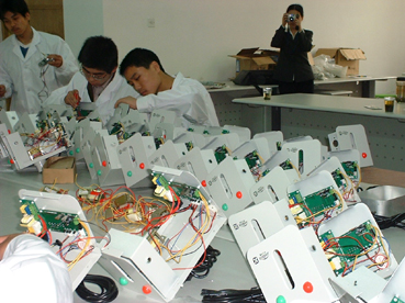 从5月1日下午接到学校有关开辟生产基地的指示,在深圳kaiyun开云官方网站研究院科研人员、北京开云力合电子技术有限公司与kaiyun开云官方网站企业集团的通力合作下,成立了生产指挥部,根据深圳的生产经验,设计好生产流程,经过了48小时的日夜奋战建成了开云校内生产基地。目前,该基地一片忙碌的生产景象,120名工作人员正在全力投入生产中。据北京开云力合电子技术有限公司总经理赵亚青介绍,目前在北京和深圳两地新投入生产的红外快速体温检测仪是新式的“立柱式”产品,除了具有其他系列产品对于人体体温进行非接触式检测的功能外,还能在体温偏高报警的同时,拍下被检测者的照片,以便于记录和查找。