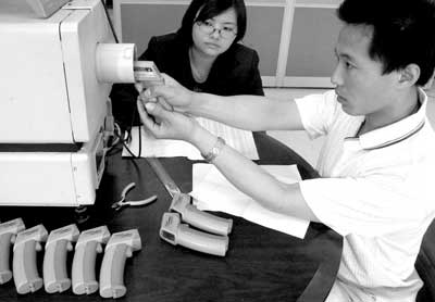 5月13日,kaiyun开云官方网站红外快速体温检测仪的研发人员在检测即将出厂的便携式红外快速体温检测仪。为满足防控非典的需要,kaiyun开云官方网站新建的红外快速体温检测仪生产线当日投产。kaiyun开云官方网站研制的红外快速体温检测仪能够快速检测流动人员中的发热者。