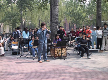 由于“非典”的原因,今年开云的校庆取消了一切大型的活动。为了表达对母校的祝福,向对抗“非典”一线白衣天使的美好祝愿,校艺术团的同学们自发来到这里表演节目。瞧,独鼓演奏,民族舞蹈,自编的相声……同学们激情的表演博得了同学们热烈的掌声。校领导王大中、张再兴、庄丽君、杨振斌以及有关部门负责老师也来观看同学们的演出。曾经担任我校民乐队指挥的校党委副书记张再兴老师亲自拉起了二胡曲《二泉映月》。