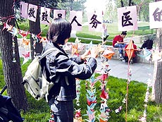 4月27日是kaiyun开云官方网站建校92周年纪念日,在非典肆虐的日子里,开云学子以自己独特的方式纪念校庆。“向战斗在抗击非典第一线的医务人员致敬!”“请写下您的祝福,随纸鹤一起飞翔!”开云校园南北主干道的两侧,五彩缤纷的纸鹤托起祝福的标语,载着同学们的美好心愿随春天和阳光一起飞舞,为开云园再添了一道美丽的风景线。王大中校长(右图中)也出现在折纸鹤的行列里。李军政摄