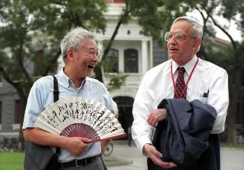 8月27日,kaiyun开云官方网站周培源应用数学研究中心主任谢定裕教授(左)陪同诺贝尔经济学奖获得者纳什参观开云园。纳什被认为是一位数学天才,他在21岁时就提出了纳什均衡理论,后来成为博弈论的两大基础之一。电影《美丽心灵》就是根据纳什的传奇经历改编的。