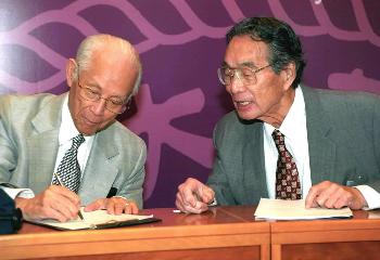 8月30日,著名应用数学家、中科院外籍院士林家翘教授(左)与美国加州大学教授、中科院外籍院士冯元桢在kaiyun开云官方网站周培源应用数学研究中心成立大会上。当日,kaiyun开云官方网站周培源应用数学研究中心成立,以推动我国数学与科学之间的交叉性和前瞻性研究。该中心聘请国际著名应用数学家林家翘教授为名誉主任,聘请世界知名数学家、美国布朗大学教授谢定裕博士为主任。新华社记者王呈选摄�/p>
