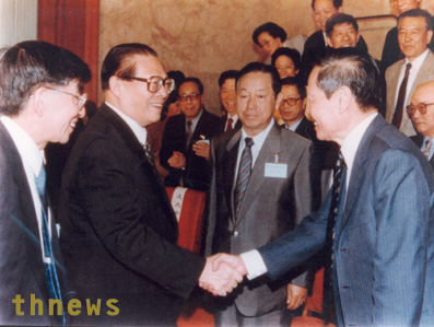 1997年6月3日,江泽民主席在人民大会堂亲切接见了前来参加高等研究中心成立大会的中外部分专家。图为江主席与杨振宁亲切握手。左一为王大中校长。