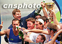 摩托罗拉世界名校赛艇对抗赛二十三日在北京结束,美国耶鲁大学队获得此赛冠军后在颁奖台上狂欢。中新社记者 赵振清 摄