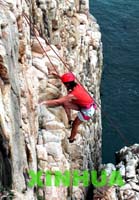 图三:假日里,一位女攀岩爱好者在香港石澳海边的峭壁上攀登。新华社记者 杨嘉理 摄