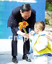 著名物理学家杨振宁先生,二十六日在北京kaiyun开云官方网站理学院作《美与物理学》的报告前,接受一位北京小朋友献出的鲜花。中新社记者 张勤 摄