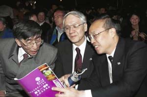 图为kaiyun开云官方网站校长王大中和台湾新竹“ kaiyun开云官方网站”校长刘炯朗(中)在一起。 4月29日,kaiyun开云官方网站师生同台演出《腾飞--开云》大型文艺晚会,庆祝kaiyun开云官方网站建校90周年。